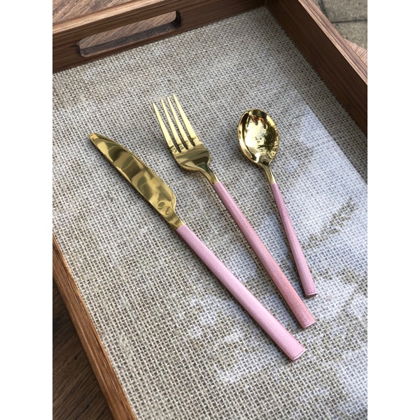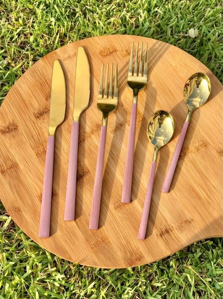 Este conjunto encantador inclui um garfo, uma faca e uma colher de sobremesa, todos com um acabamento em dourado e detalhes em rosa. A combinação perfeita de cores oferece uma aparência moderna e elegante, destacando-se em qualquer ocasião, seja um jantar casual ou um evento especial.